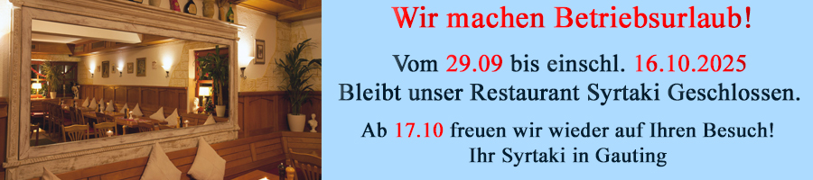 Bitte beachten Sie unsere veränderten Öffnungszeiten!Liebe Gäste und Freunde der griechischen Küche, Unsere aktuelle Speisekarte sowie Angebote finden Sie auf unserer Homepage unter: www. syrtaki-gauting.de Unsere ohnehin hohen Hygienestandards werden wir natürlich angesichts der aktuellen Situation weiter verschärfen. Wir wünschen allen beste Gesundheit und hoffen auf ein baldiges Wiedersehen … Ihre Familie Karampoulat |